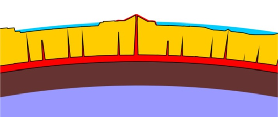 Из-за уменьшения кривизны планеты, связанного с её расширением, гранитная кора, в зависимости от того где изначально были слабые места, потрескалась. И потрескалась не равномерно, а хаотически, к примеру, как показано на рисунке ниже.