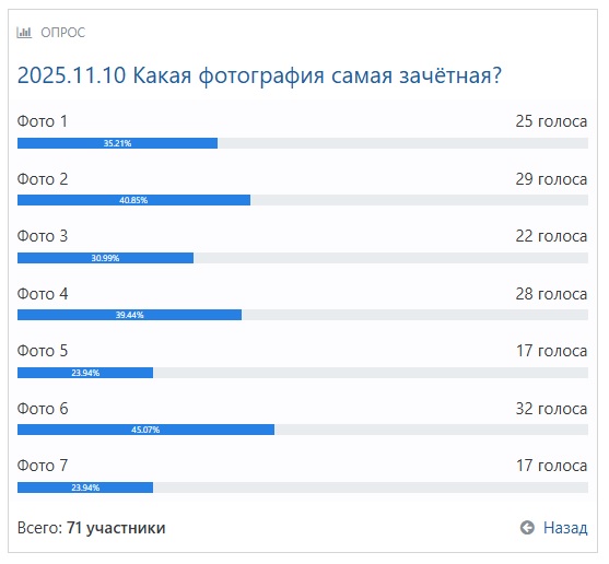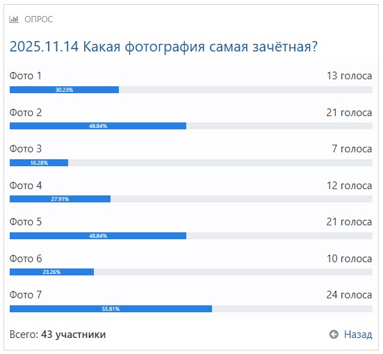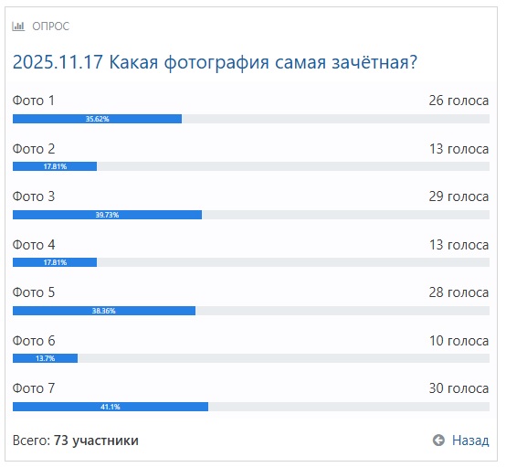 Понедельник. Традиционная рубрика. Традиционно под надписью "Push me!" прячутся семь изображений. Выбирайте лучшую фотографию. Вы можете проголосовать по ссылке, расположенной после самих фото. А в комментариях давайте просто поговорим, почему вы отметили ту или иную фотографию. Push me!![]() 2. ![]() 3. ![]() 4. ![]() 5. ![]() 6. ![]() 7. ![]() Проголосуйте по ссылке до 22:00. А я чуть позже опубликую результаты. Результаты голосования: ![]() ____________ Сегодняшний бонус -- традиционный ежемесячный анонс: